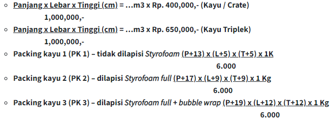 Penambahan packing kayu tersedia di konter pengiriman dengan perhitungan perkiraan harga tambahan sebagai berikut: